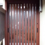 玄関引戸リフォームのご紹介です。木製の玄関引戸が経年劣化で色落ちや腐食が進んでいました。愛犬にも少しかじられてしまったようですね。今回は、リフォーム玄関1 -