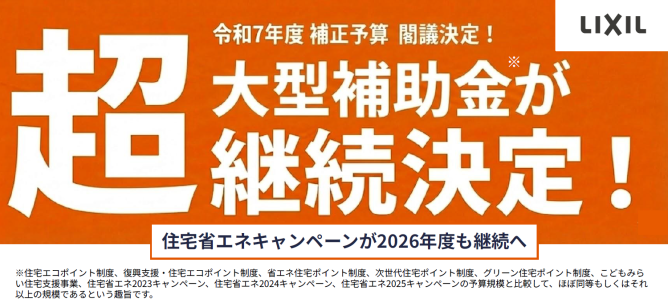 住宅省エネ2026キャンペーンは、断熱窓や高効率給湯器などの省エネリフォームを対象に、最大100万円の補助が受けられる国の大型支援制度です。2026年度も継続が決定しており、今後のリフォーム計画にぜひ活用したい制度です。