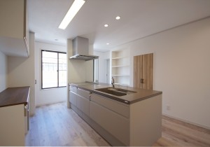 和室とDKは間仕切りをなくして18帖超のLDKにしました。キッチンはアイランド型を採用。天板が広く、収納も両面を使えます。北側窓からの採光を利用しつつ外部からの視線は遮るように、キッチンの端に目隠しの壁を設けました。